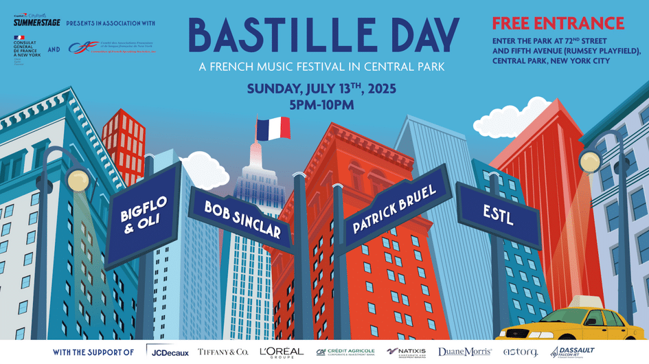 Le même dimanche 13 juillet, de 17h00 à 22h00, Central Park accueille un concert gratuit exceptionnel au Rumsey Playfield. Organisé par le Consulat général de France à New York et ses partenaires, cet événement rassemble chaque année plus de 10 000 spectateurs dans un cadre magique. L’année dernière, ce record de fréquentation témoigne de l’engouement des New-Yorkais pour cette soirée musicale unique.